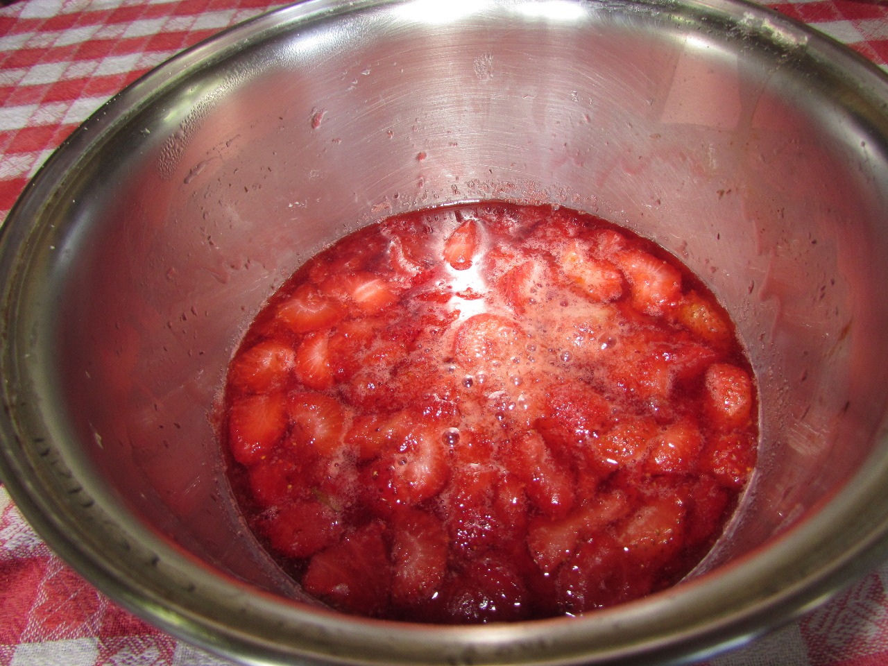 2. Lave os Morangos.Junte-os com 3 colheres(Sopa) de açúcar mais 3 colheres(Sopa) de água.Quando o mesmo estiver como um caldinho branco,Reserve-os;