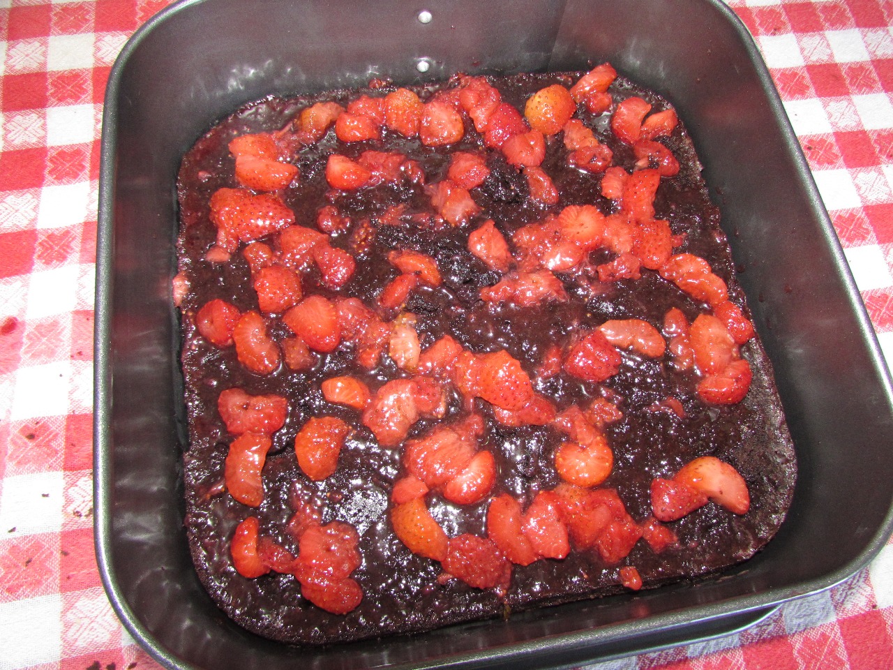 5. Em cima do Brawnie coloque os morangos,logo depois os cremes;